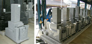 たぶん西日本(東海から京阪神)の石屋さんへ行くと一般的な和型(左下写真のような良くある普通の形)のお墓は京都型とか名古屋型とかの名前が付いて売っていると思います。関東では関東型などと呼んだりする定番型がありますがあまり西日本ほど細かく呼び分けがないようです。 名古屋型、神戸型とか呼ぶのは昔からその地方に多かった、昔のその地方の石屋さんが考え出して他の人がまねをして自然に広がり石屋さんの間で自然に呼ばれるようになった便宜上の名前ですからあまり深く考える必要はありません。また各石屋さんが独自に自分のお店だけで呼ぶ名前を付けている事もあります。鈴鹿周辺地方は比較的名古屋型が多いです。これはちょっと昔岡崎の石が多く使われていた影響です。愛知県尾張・三河から岐阜県の美濃平野・下呂・高山方面に名古屋型が多いようです。 お墓は自動車のように大メーカーで作ってどこのお店でも同じものが売っているわけではありません。よく見ると同じ名前で8寸○○型と書いて売っていても細かい部分や寸法が少し違います。このお店は少し安いなと思ったら寸法を測ると下の台の寸法が少し小さかったり、背が少し低かったり、細かい部分の細工が簡単にしてあったりするので注意が必要です。でももちろんそれを気に入って購入するのは全然悪い事ではありません。