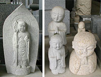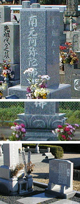 ■右上段写真昔は二人分のお戒名を前に書いて、夫婦墓と言って一つのお墓に夫婦で入る、配偶者のない場合は一人ずつ入るタイプが一般的だったようですが30〜40年前から先祖代々と書いて家族がみんなで一つのお墓に入れるようにした方法が一般的になりました。南無阿弥陀仏とか宗派により倶会一処などを書く場合もありますが「先祖代々の墓」と同じ様に家族みんなで使います。 南無阿弥陀仏や先祖代々の墓と掘った下に蓮模様を掘ります。その意味は仏教の観音様や各種仏像が蓮の花の上に立っているのと同じ意味です。 ■右中段写真 蓮を掘る代わりに石で“蓮花”が作ってあります。 ■右下段写真 普通一般的な和型のお墓はサイズに関係なく、お戒名を右面と左面に合計4人書けますが一人一人の字が少し小さくても良ければ8人まで書けますから最高四代目の方まで使える計算になります。 旧家の方などでご先祖が多くて書く場所が足りない場合は戒名板と言ってお墓の横にお戒名を書く板状の形の碑を作ります。 |