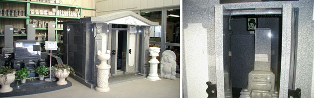 | 大切な墓石を雨風から守ります。また室内にご遺影や亡くなった方のご遺品を保管できます。他にもアイデア次第で従来の露天型のお墓にはできなかった様々な使い方が可能です。奥の壁に遺影が飾ってあります。お隣の国韓国では最近土葬から火葬に変わったためこのような家型のお墓の内部に棚をたくさん作って親戚中の全員のお骨(100人分以上)を壷で保管する形式に徐々に変わっているようです。日本の沖縄地方も前面の壁がありませんが屋根付きのお墓を作ります。 | ||