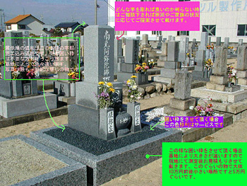 | 普通、一般的にはいくらぐらいのどんな囲いを作れば良いのですか?と言ったご質問をよくいただきます。しかし実際の所、小社のある同じ鈴鹿市内でも墓地によって敷地の大きさや一般的なやり方が違いますのでお見積もりの前にまずは現地を見させて下さい、ある墓地では一般的な事が隣町の違う墓地では一般的ではない事が多々ありますのでこれが一般的で××円ですと言う風にハッキリとご紹介できない事をお詫びいたします。 町内の墓地(鈴鹿の方言?で“さんまい”)では通常(特に白子。神戸などの古い町)シンプルな感じの物が多いですが、同じ鈴鹿市内でもある墓地では大多数の方が高さの高い囲いを作ったり、けんち積み(上写真参照)が90%以上の墓地もあります。 同じ鈴鹿市でも西部の山に近くなるほど墓地が大きく、又民間企業運営型の公園墓地などは豪華な巻石になっていく傾向があります。 価格目安の一例と致しましては左写真の様な囲いですと高さ約20cm(7寸と呼びます)で約1.5m四方の広さがありますので合計6mの延べ石が必要です。石質や磨きの有無によって価格差がありますが(写真は磨き無し)¥15,000=1mあたり、ぐらいからご用意させていただいてますので左ぐらいの物は約¥9,000ぐらいとなります。もう少し高さの低い物はその分お安くなります。ご注意:同じぐらいに見えても寸法を測ると結構違うものです、1m角の敷地と1.1m角の敷地では延べ石の合計が10%違いますので総工事価格も10%あがります墓石が1基やっとm角の敷地と建つ様な広さ(1m角ぐらい)ですと¥4〜5万ぐらいから出来ます。 土地の寸法がみなさん違いますので、お見積もりの前に現地を見せていただく必要があります、どうぞお気軽にご相談下さい、もちろん現地測定お見積もりはご注文の有無にかかわらず無料です。 |